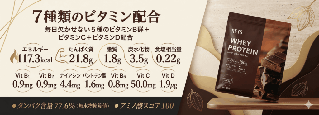 REYSは単なるタンパク質補給だけでなく、7種類のビタミンB群やビタミンCが配合されています。